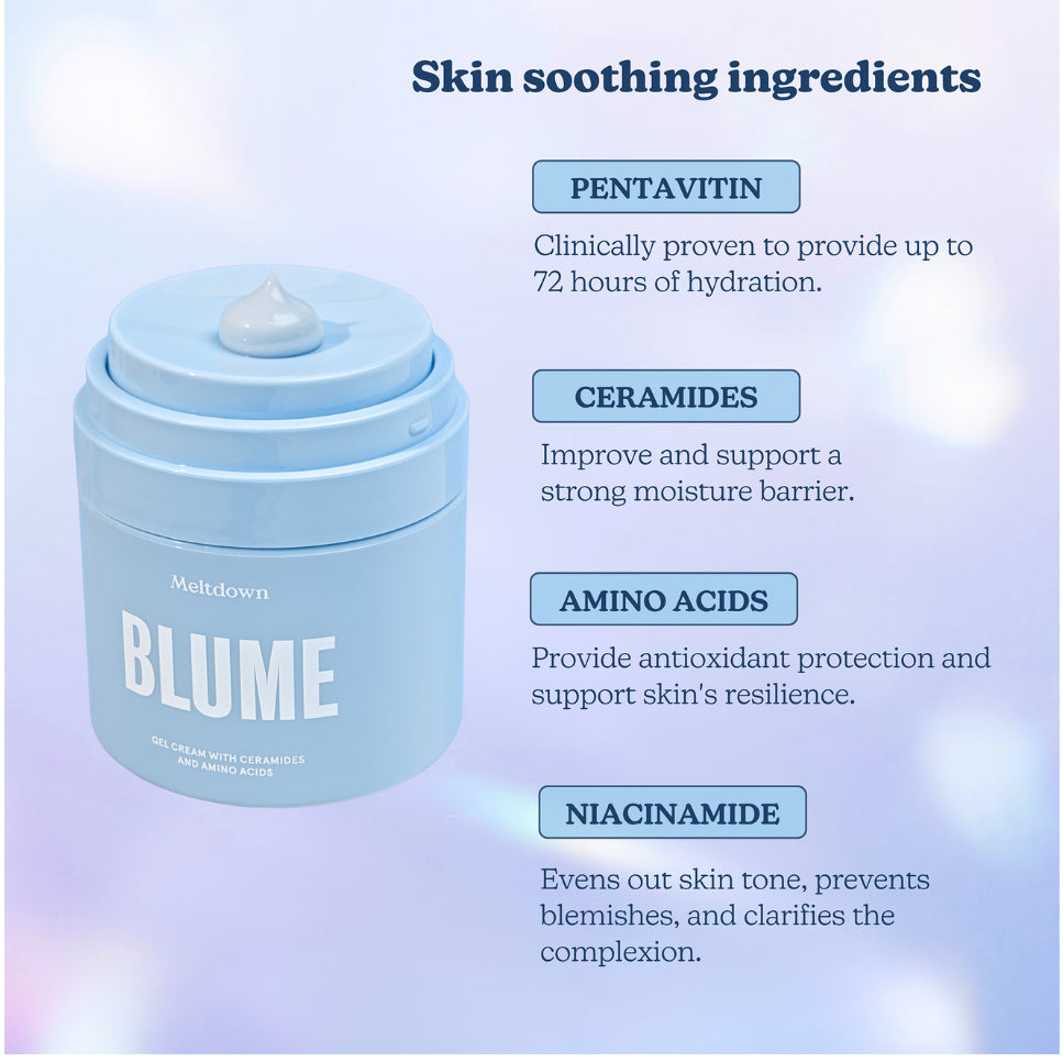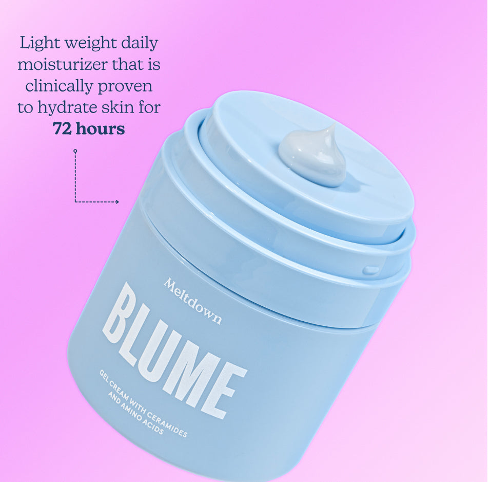 BLUME's Meltdown Gel Cream for Acne-Prone Skin is an oil-free gel cream that hydrates your skin for up to 72 hours, provides blue light protection, and is made especifically for acne-prone skin.