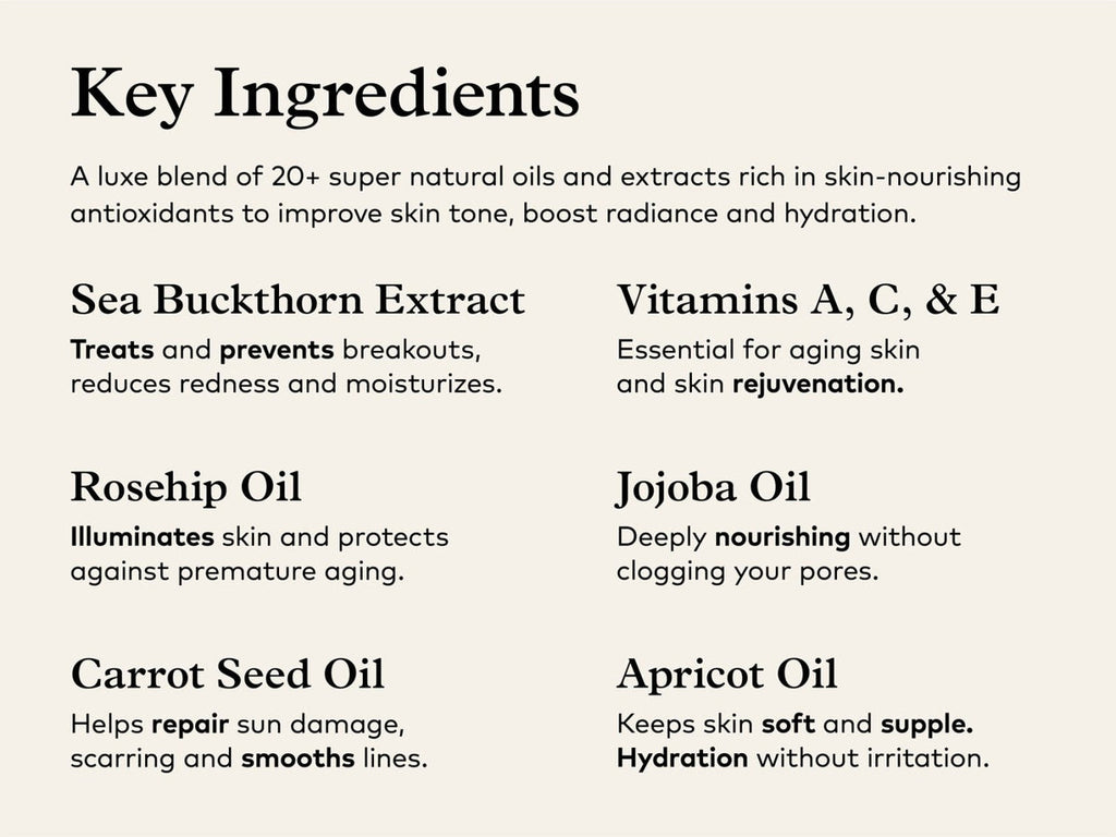 A luxe blend of 20+ super natural oils and extracts that deeply hydrates, smooths fine lines, fades skin damage and delivers that golden hour glow.